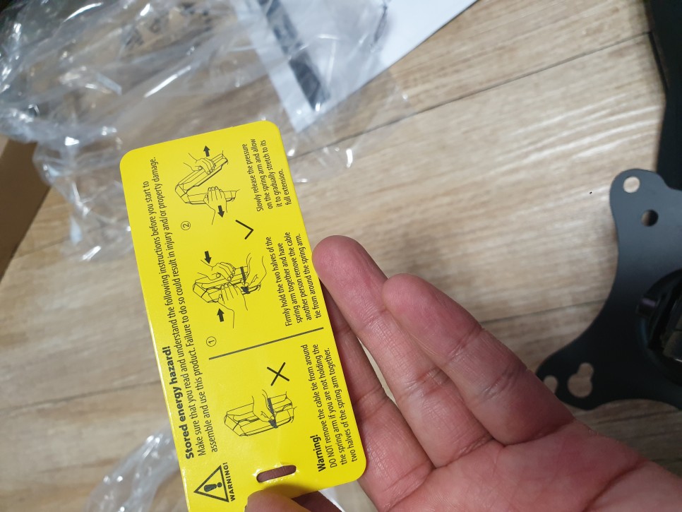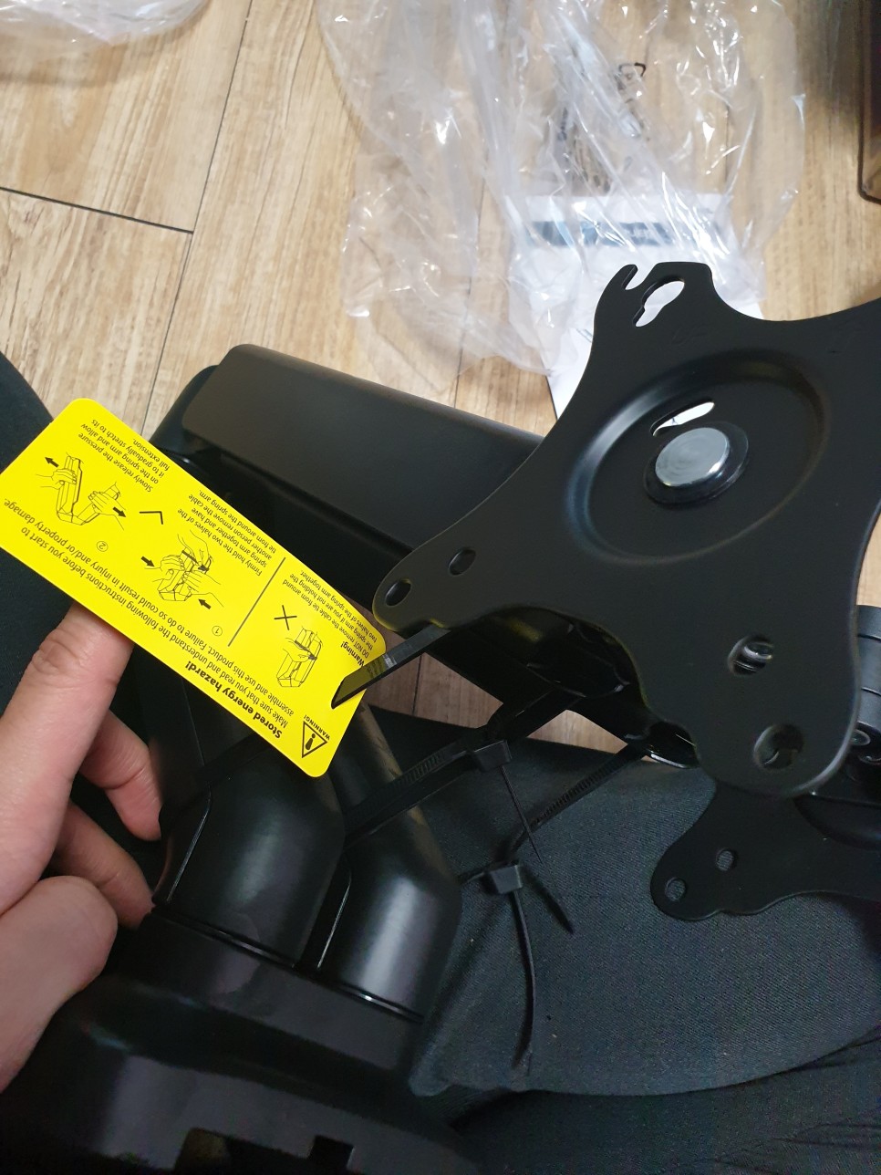 카멜 CA-1D 모니터암 패키징에 케이블 타이로 압축이 되어포장이 되어있는데, 타이에 '노란색' 라벨로 주의사항이 표시되어있습니다.