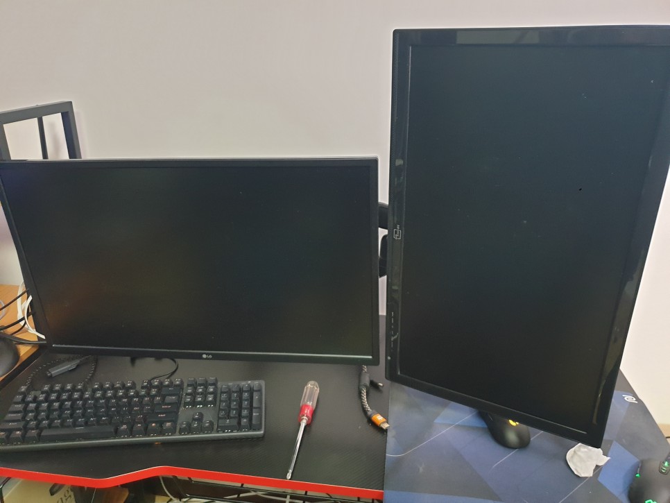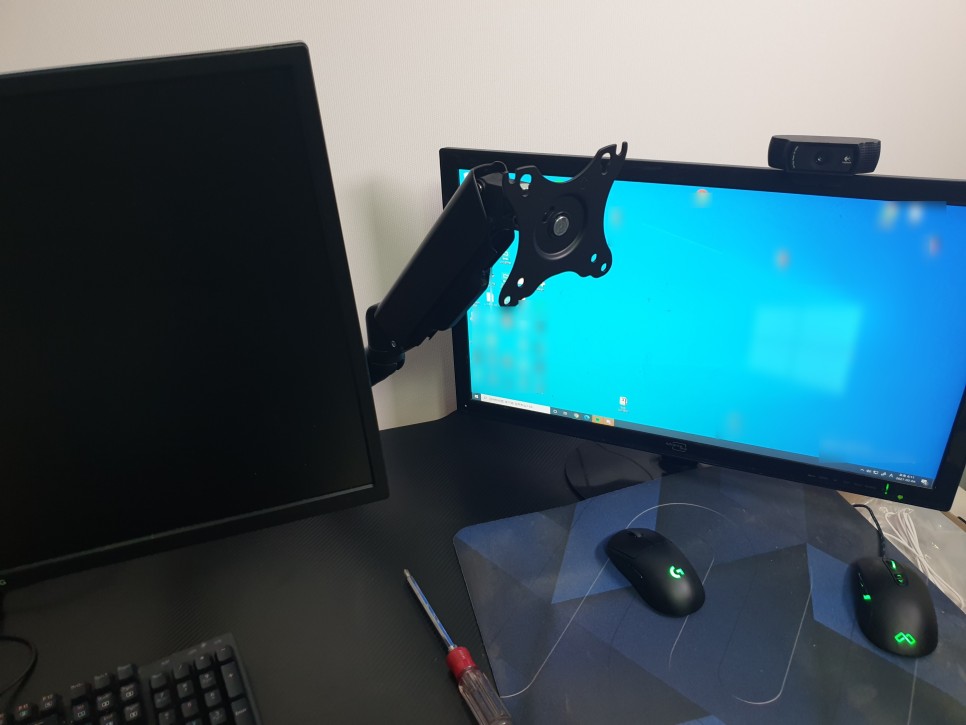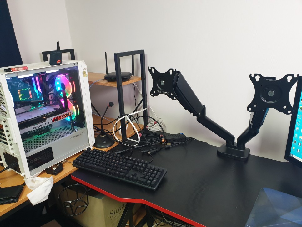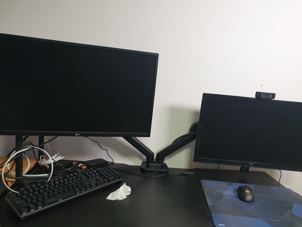 모니터암을 설치하기 전에 모습입니다. 저는 우선 2컴으로 방송을 진행하고, 두 모니터 모두 스탠드를 사용하고 있는지라, 모니터 스탠드에 간섭을 받는 키보드와 무선 마우스 때문에 불편함을 겪었습니다. 이사한지 얼마 안되어서 책상도 그렇고 좀 많이 지저분하네요