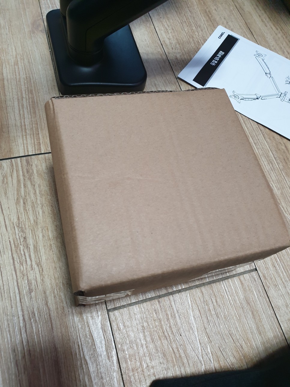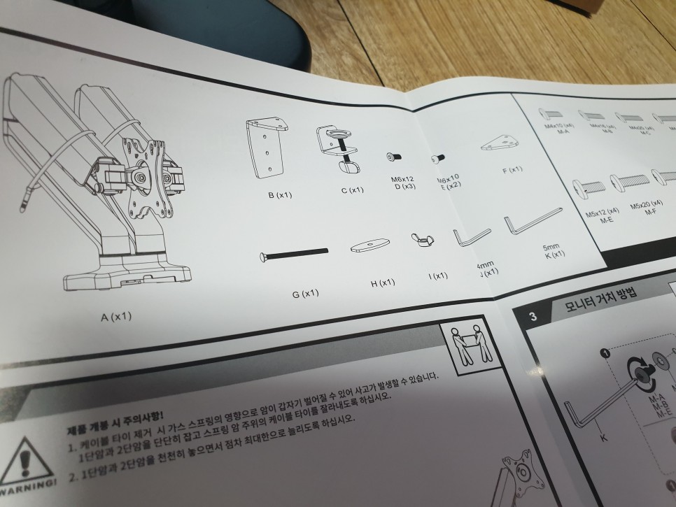 제품 박스를 뜯어보면, 모니터암 본체 (A)와 상품 설명서, 그리고 부품 박스로 이루어져있습니다.