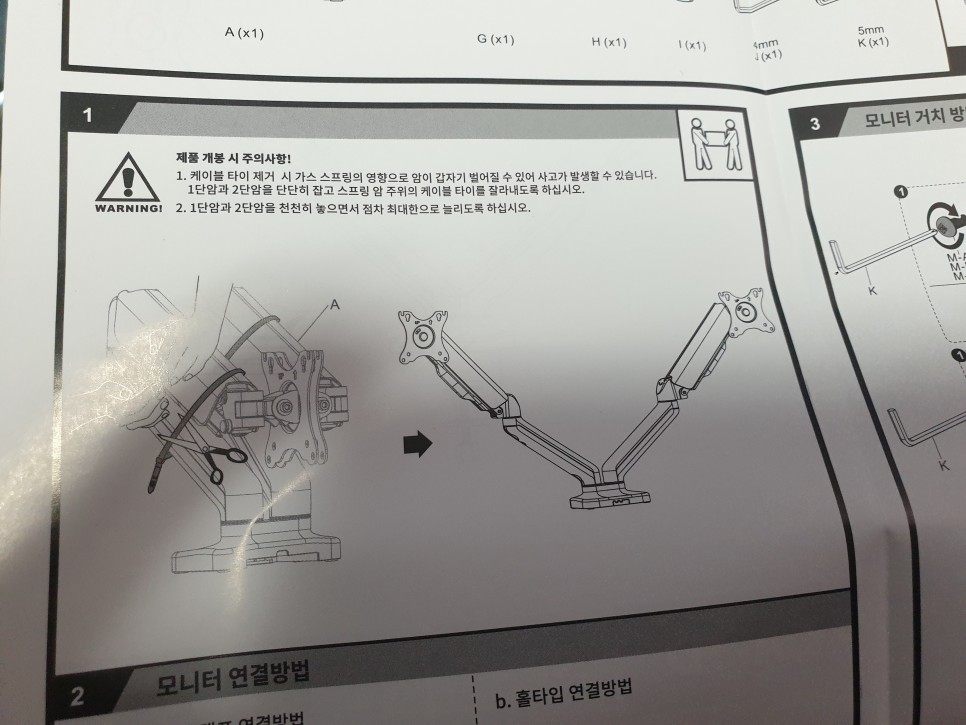 케이블 타이를 끊어낼 때, 압축이 되어있는 스프링 장력이 훅 펴지게 되면서, 제품이 파손되거나 얼굴을 가까이 대어서 끊어낼 경우에는 다칠 수 있습니다. 베사 판넬 이 묵직하다보니 꼭 '성인 남성'이 압축이 되어있는 모니터암에 힘을 가해서 접힌 상태로 제거해야합니다.