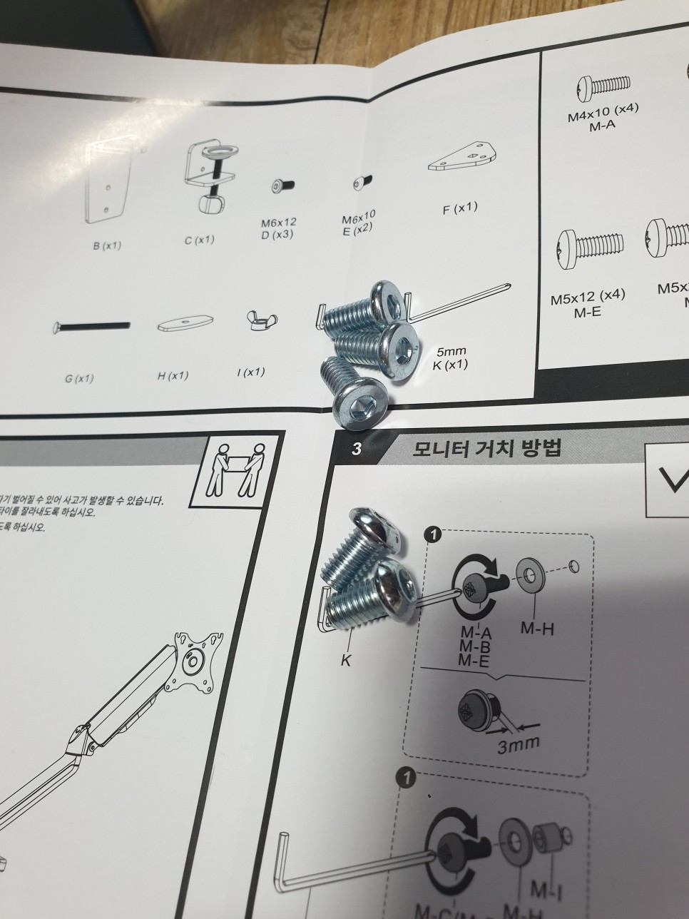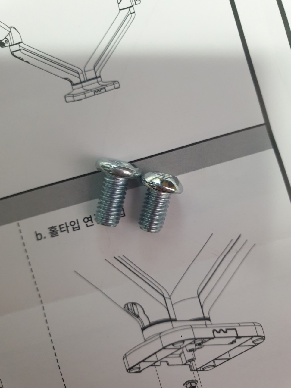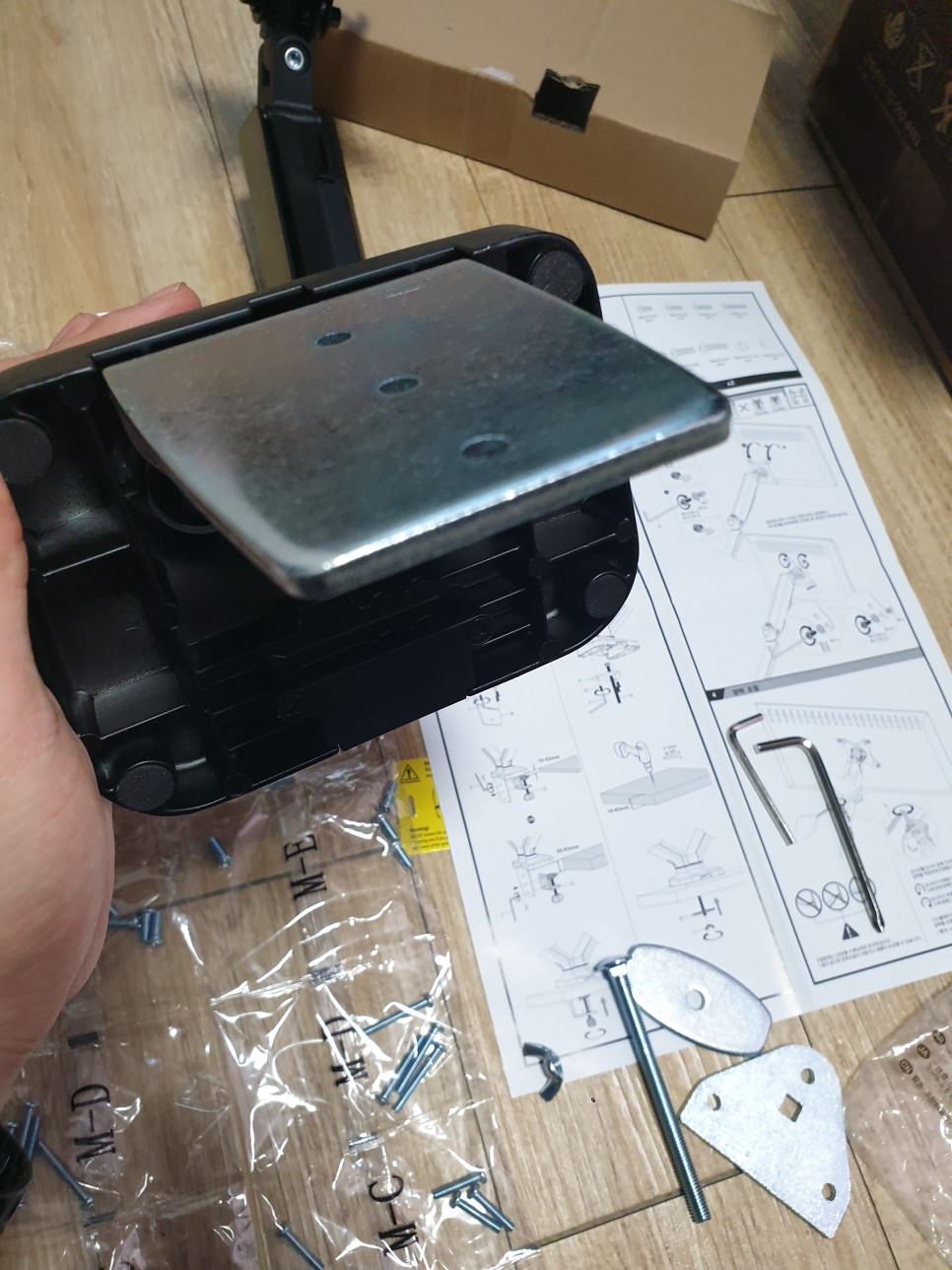 내부 구성품들은 크게, 책상에 어떻게 연결할건지에 대한 '큰 파트'의 부품과 '모니터 규격'에 맞는 '베사홀'에 관한 나사가 들어가있습니다.