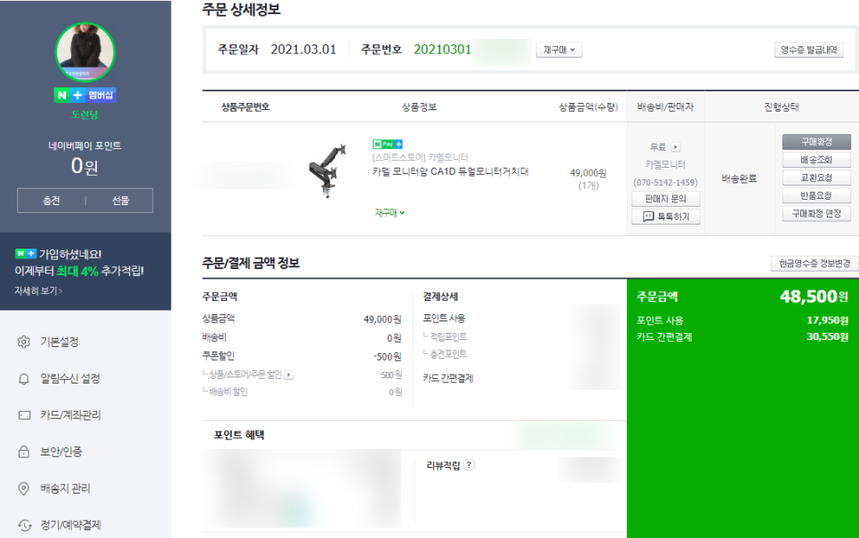 모아두었던 네이버 포인트를 사용해서 , 48500원에서 약 18000원을 할인 받아 저렴하게 구매했습니다.